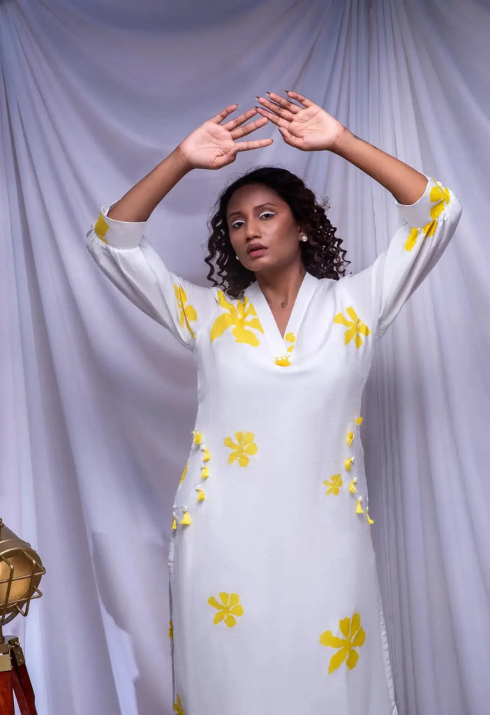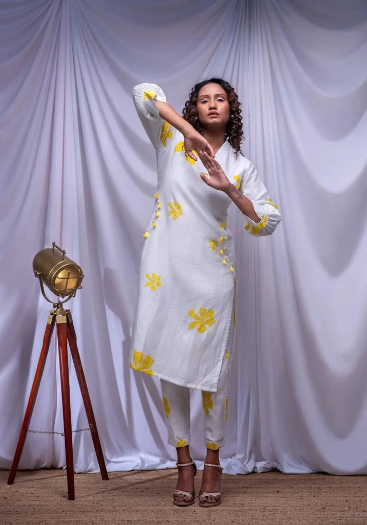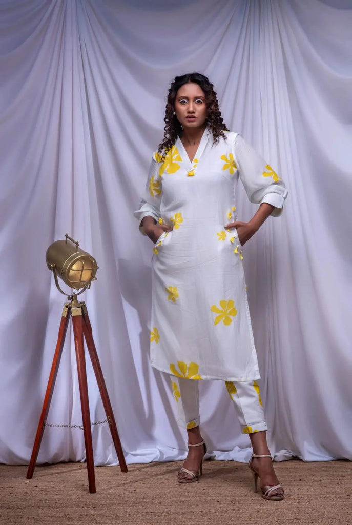 Yellow flower print V-neck collar kurti with side pockets & puff sleeves paired with straight pencil pants. Perfect for summer brunches and strolls.