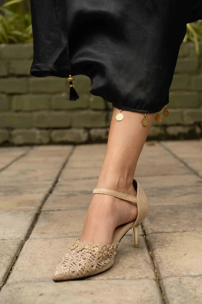Black cuff length Jump suit with fire print half collar and flared sleeve and embellished with gold coin and zip. Perfect for casual dinner and vacations.