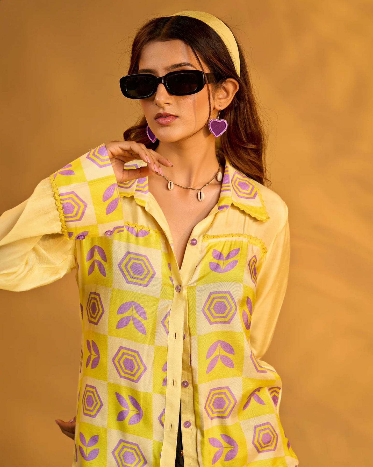 Step up your style game with our Yellow Shirt in Small Tiles Print, featuring elegant cuff sleeves. The cuffs add structure and a touch of formality, making the shirt versatile for both casual and more dressed-up looks. Pair with high-waisted jeans and loafers for a relaxed yet stylish look.