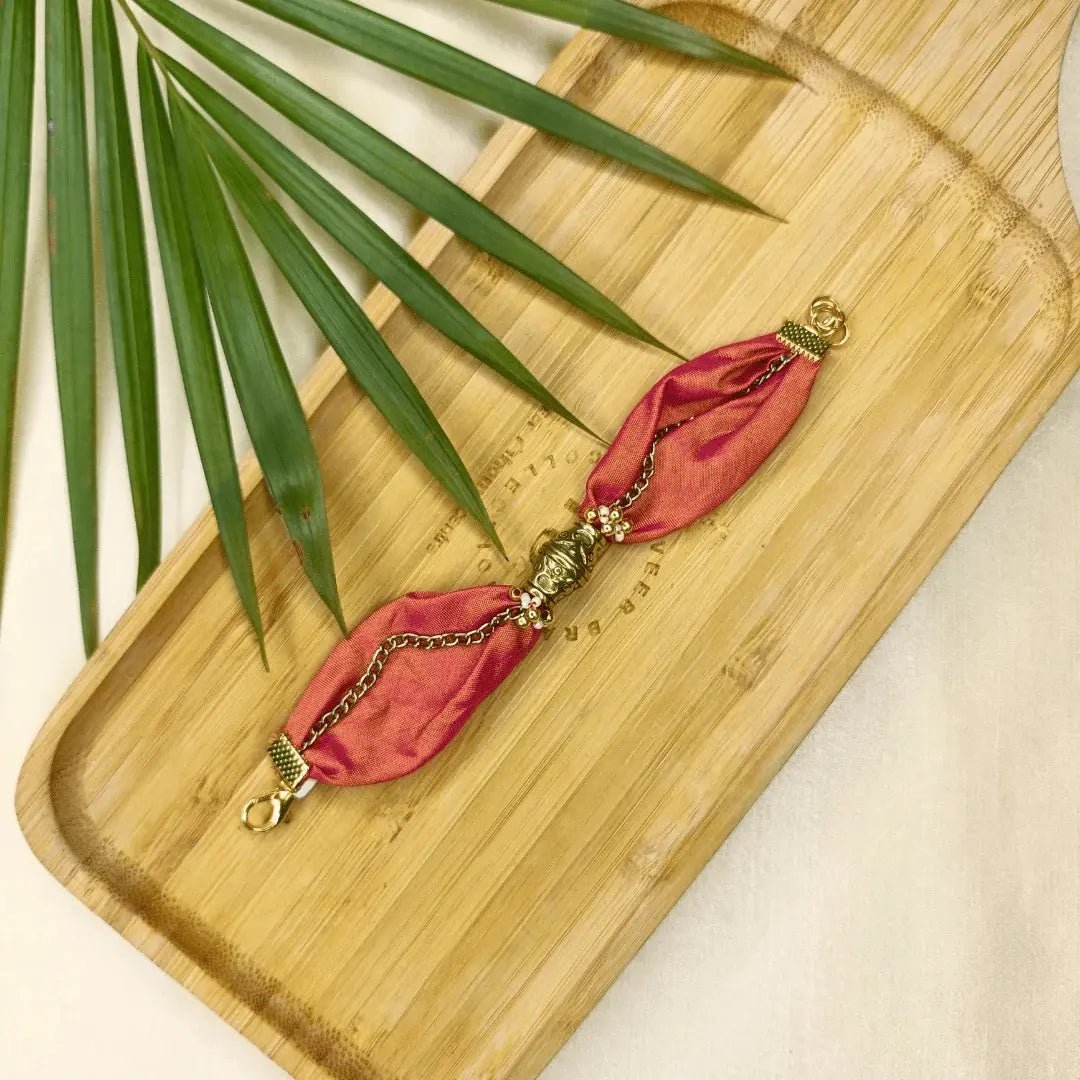 Add a touch of vintage charm to your look with our Antique Orange Bracelet. Handcrafted with care, this unique piece blends soft orange fabric with shimmering golden beads to create a bold yet elegant statement.