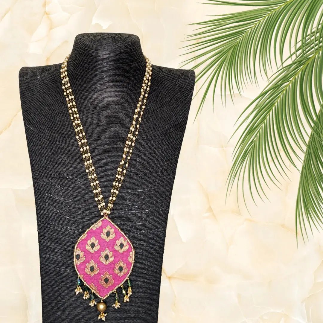 Add a touch of elegance to any outfit with the Parnika Golden Necklace and Earrings set. The beautiful pearl chain and brocade fabric pendant adds a classic charm to this set. Perfect for both formal and casual occasions, this set is a must-have for any jewelry collection.