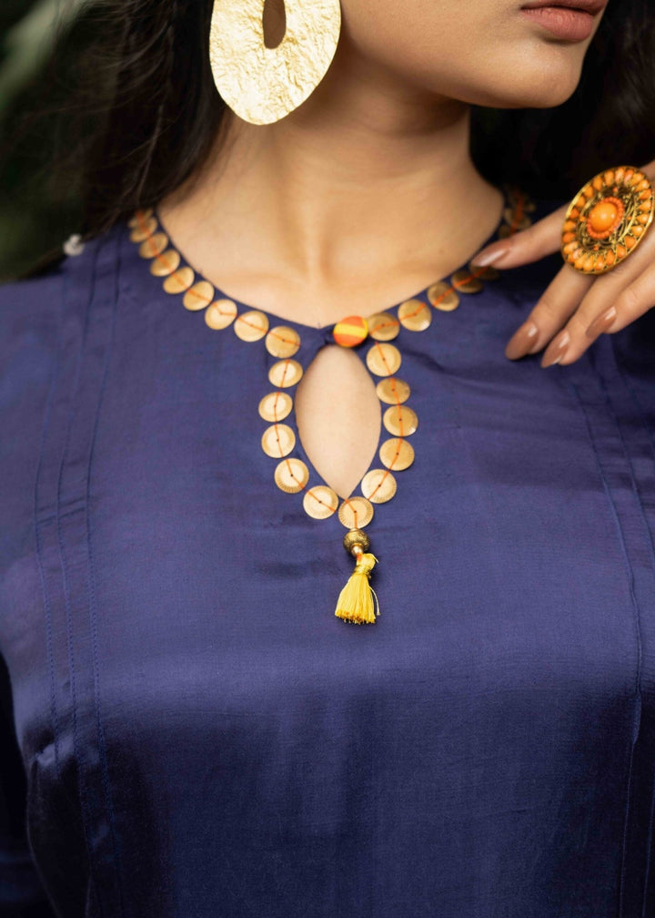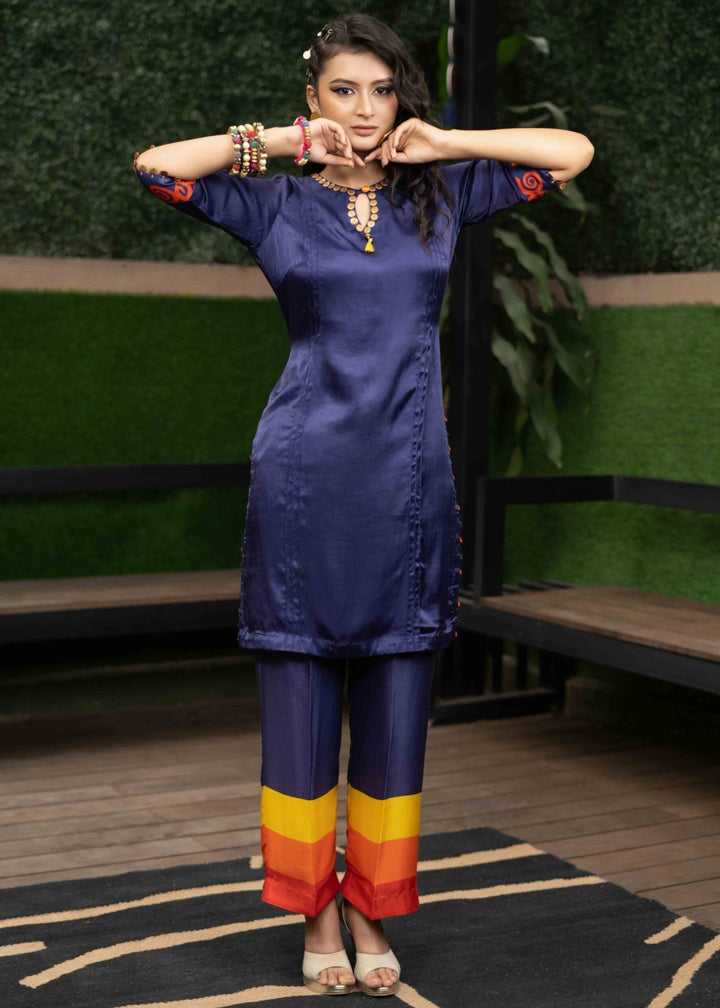 Navy Blue Kurti highlighted with pintucks, border and embroidery on the neck and sleeve, loops on the side slit. Paired with ombre pant. Perfect for modern occasion.
