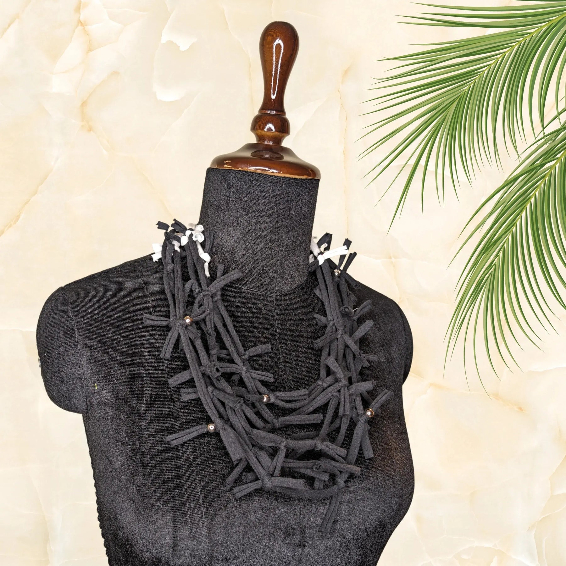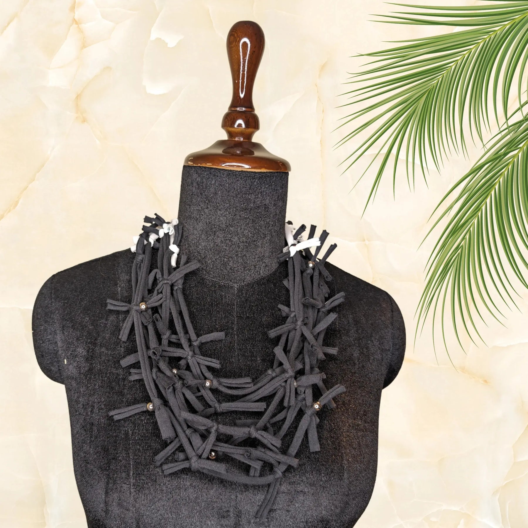 Imbued with the charm of artisanal craftsmanship, our knotted necklace exudes elegance and creativity. Handcrafted with precision and care, each knot is a testament to the skill and dedication of our artisans. Elevate your style with this unique piece of fabric jewelry, where tradition meets contemporary flair.